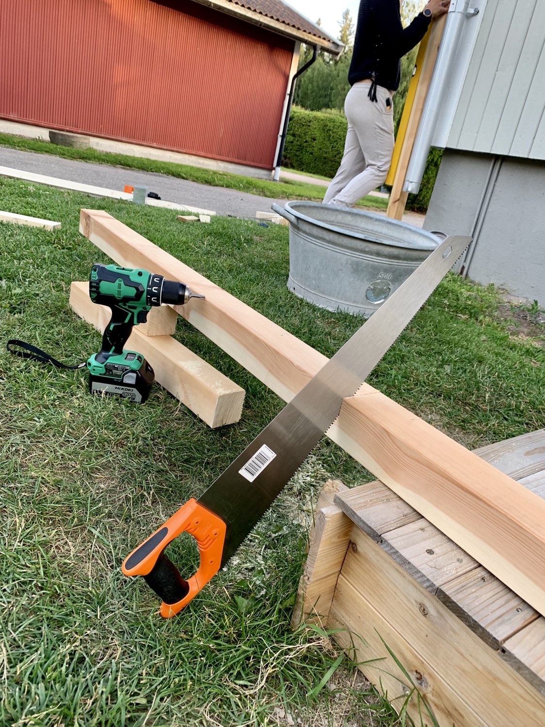 Vi kunde börja så smått igår med att sätta upp stolparna och förbereda för ytterligare jobb under de kommande dagarna. Tur då att jag sitter inne på fina kvalitetsgrejer som riktiga snickarkläder och även min nya skruvdragare från Hikoki, ”Hikokan” som jag kallar den för. Den fick bekänna färg direkt igår när jag dunkade in stora skruvar i stolparna, eller reglarna som det visst kallas. Den var så stark att när skruven var i bott så höll jag på få en käftsmäll när skruvdragaren vred till sig. Skapligt!