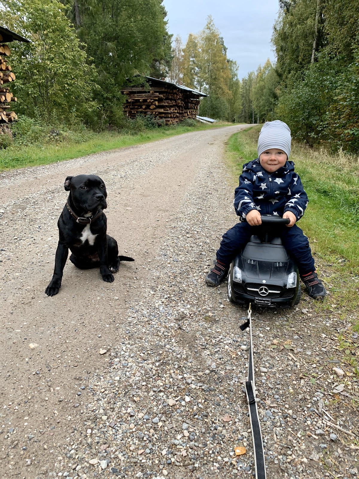 Under gårdagens vilodag så tog jag med mig grabbarna på en liten promenad. Alfons satt mestadels på sin lilla bil som vi har fäst ett hundkoppel i och Boris var lös. Alfons tycker det är väldigt roligt att åka omkring på sin bil och Boris är väldigt lydig faktiskt. Jag tränade honom flera gånger på att stanna, sitta kvar medan vi fortsätter gå och sedan låta honom springa ikapp oss. Imponerande av den lilla jäveln Boris. Mot slutet så ville även Alfons gå och givetvis prova att ha honom i koppel, även det gick bra. Skoj!