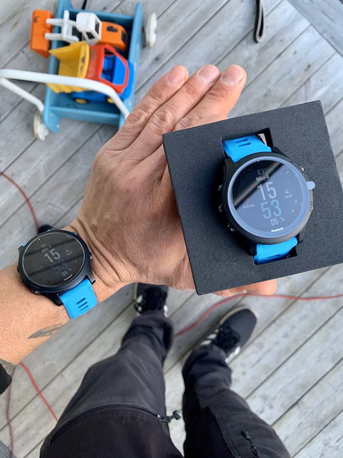 I måndags så fick jag hem en ny Garmin 945 direkt från Garmin. Anledningen till det är att jag upplevde knapparna på min förra som svampiga. Läste i forum att fler haft samma upplevelse med knapparna. Så jag mailade Garmin för att berätta det och dom skickade mig en ny. Den förra modellen var en ”Rev C” och den nya en ”Rev D”. Det står bak på kartongen som den kommer med. Om det spelar någon roll eller inte vet jag inte. Dessa knappar på den nya är något bättre, men inte riktigt det stinget som jag vill ha. Men jag vet inte om jag orkar säga till igen, den funkar ju som den ska och det är ju egentligen inga fel på den. Hur som helst så var det snabb och grym service av Garmin, det ska dom ha credd för, lite skillnad mot rövhattarna på Polar.. Beställde även hem ett skärmskydd till min nya klocka. Hade det på den gamla och känner att det är en bra försäkring mot repor på displayen.