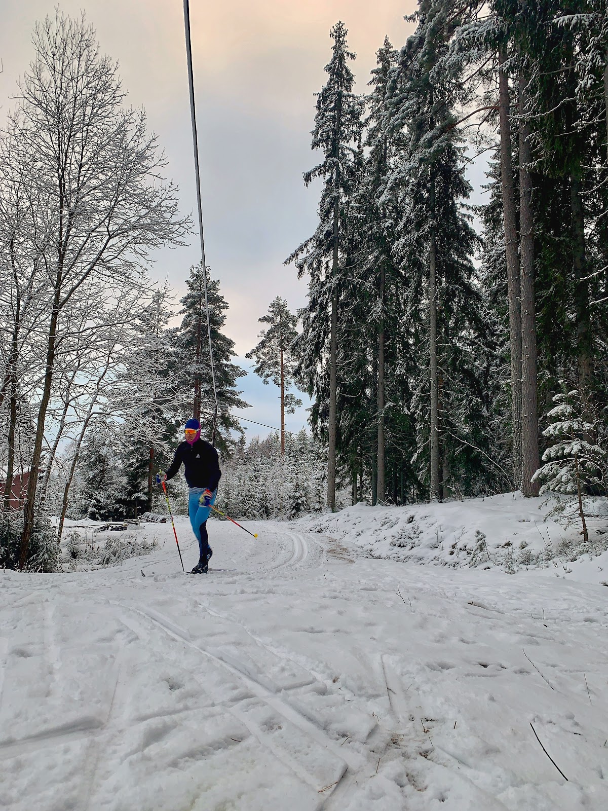 I skidspåret så blev det sedan nästan uteslutande klassisk åkning och tillsammans med Elis Weslien som stakade. När jag hade kört totalt två timmar så lade vi in tio minuter enbart stakning i en hög distansfart, vi kan kalla det för AII. På dessa tio minuter hann vi lite drygt ett varv på elljusspåret: 2,96 kilometer, 17,7 km/h snittfart och med en så pass låg snittpuls som 134. Brukar ha svårt att få upp pulsen emellanåt och så var det även idag. Tänkte att det kan vara bra att få lite högre fart i spåret med just stakning, så att det inte bara blir Skierg. Kändes okej, men det var rätt tungfört och fästvallan låg i på de ganska mjuka skidorna.