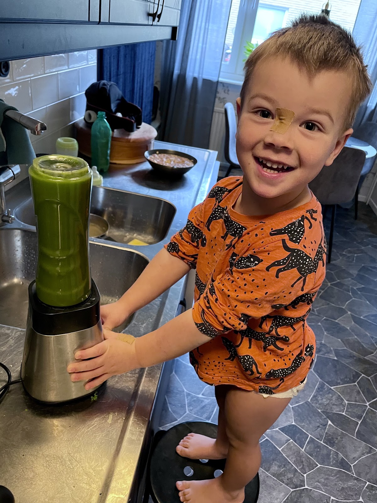 Idag fick jag hjälp med min smoothie av Alfons. Det är en fruktansvärt äcklig skapelse med selleri, spenat, grönkål och vatten. Som jag ibland brukar dricka för att jag inbillat mig att det ska vara nyttigt. Jag lyckas alltid göra den för tjock också, så att den knappt är drickbar och den ger mig kväljningar.