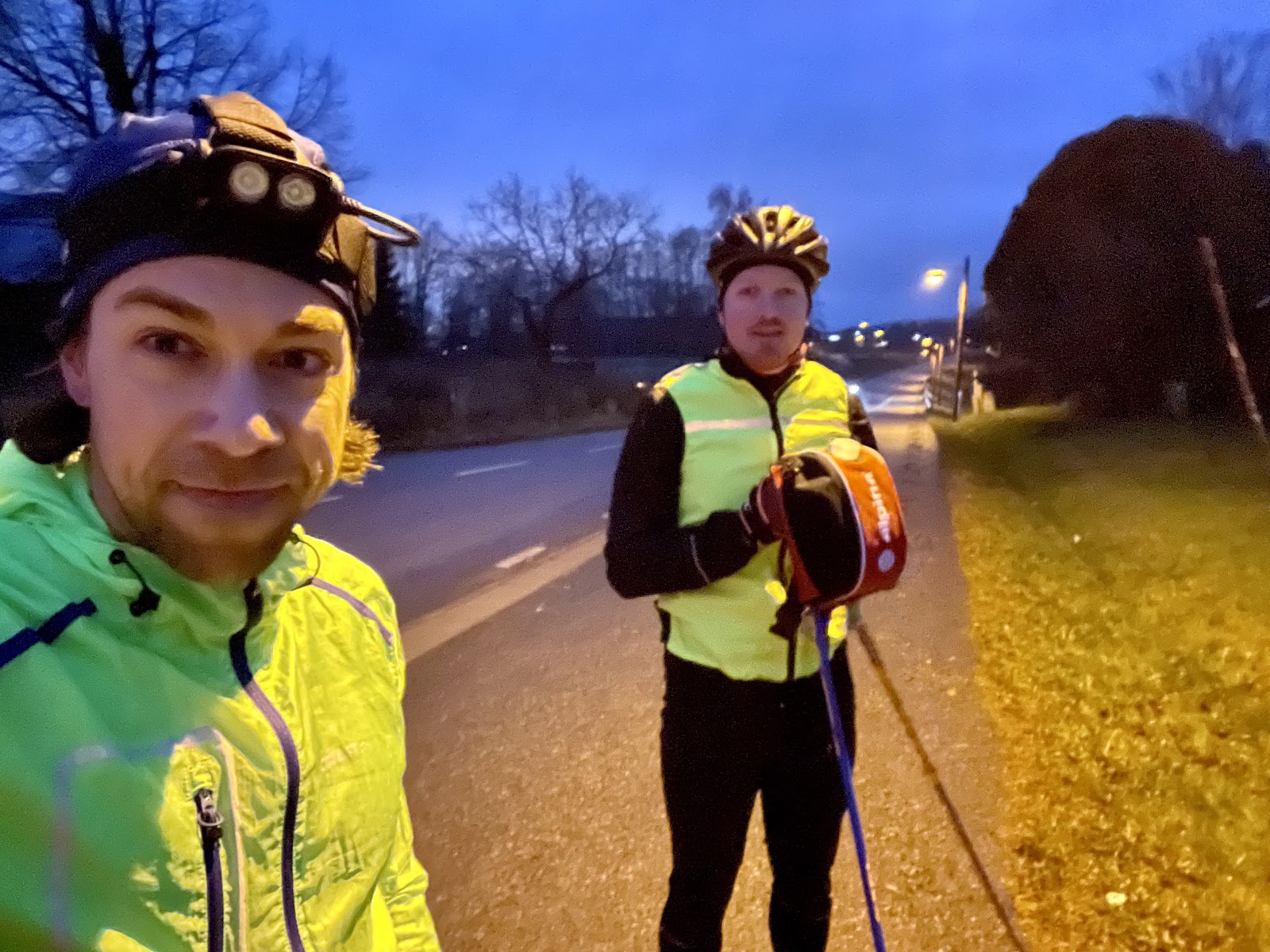 Skönt med sällskap idag. Två plus, mörkt, blött och grisigt var inte några lockande förhållanden. Men tillsammans med Adam Larsson så var det inte en tyst stund oss emellan och inte några negativa tankar. Skönt! Inte ens när stavspetsen rök halvvägs in i passet under en impuls så blev jag på dåligt humör. Jag hade ju fler spetsar med mig - trodde jag - tills jag upptäckte att jag lagt ur dom ut vätskebältet för säsongen. Det är ju trots allt vinter nu. Andra halvan fick jag åka med högerstaven i vägkanten. Det går bra det med.